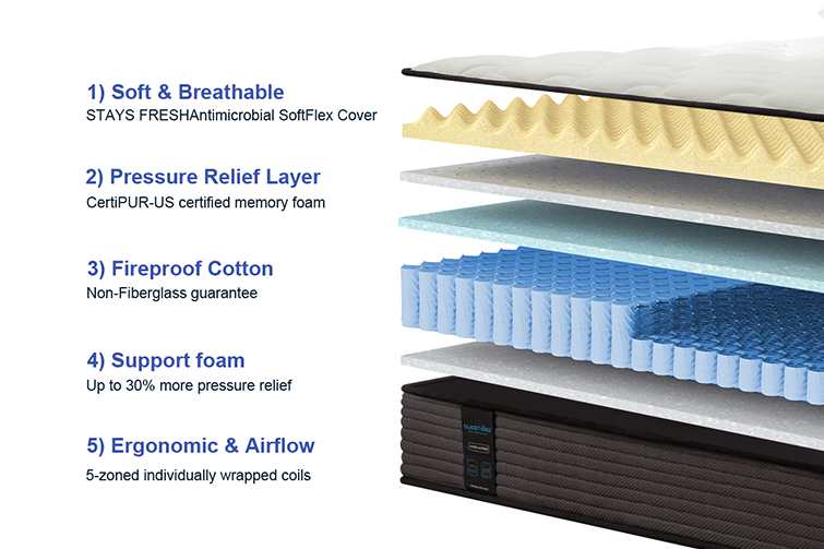 - 9" 5-zoned individually wrapped coils with enhanced edge support